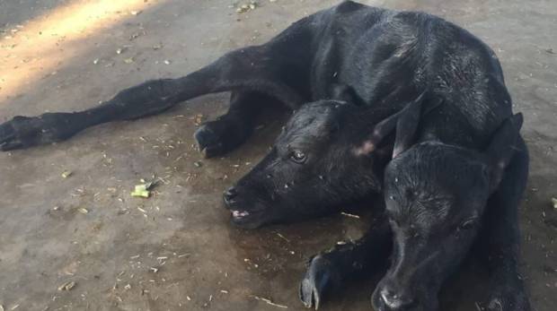 El ternero tiene un cuerpo, dos cabezas, cuatro ojos, dos bocas, dos narices y cuatro orejas como resultado de una extraña condición llamada policicefa en la que un animal nace con más de una cabeza.